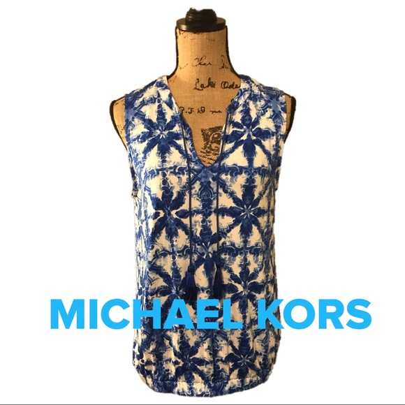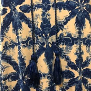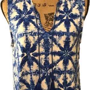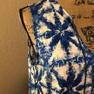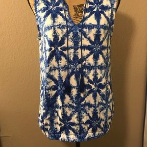 Great top. It has a beautiful blue color with white. At the bottom it has elastic all the way around the shirt.