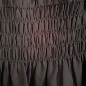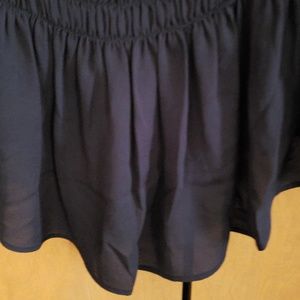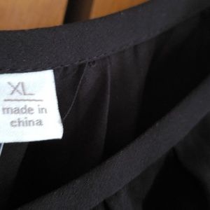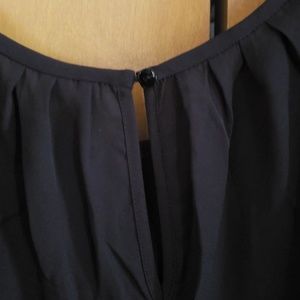 Nice black top, high-low style, peep hole long sleeves w/a button in the middle, elastic at bottom of sleeves and waistline, button at neckline in the back.