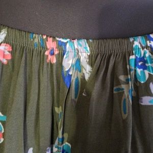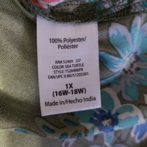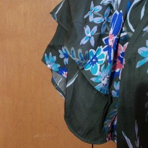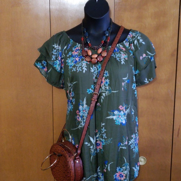 Cute olive green top w/blue, coral, aqua, and grey flowers, ruffled short sleeves, elastic neckline, see pics for size and type of material. Necklace and bag not included.