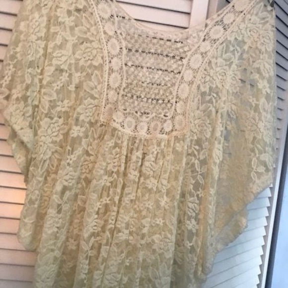 IVORY LACE OVER BLOUSE MADE IN USA. BEAUTIFUL SOFT LACE. DRAPES TO A VEE WHICH MAKES ITS VERY SLIMMING