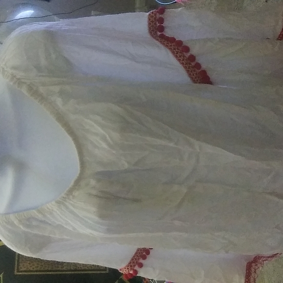 Pretty thin Top with BUTTERFLY sleeves that have round red tassels hanging off both sleeves. Wear with leggings or a skirt.