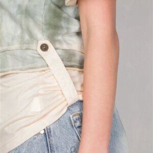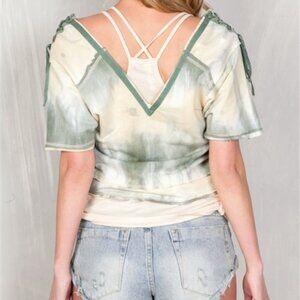 This boho inspired top features: 2 in 1, tie dye print, lace up shoulder detail, button detail at neckline,short sleeved, dropped shoulder, side button up closure detail while under tank top features top back has criss cross straps.