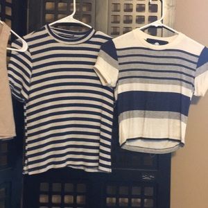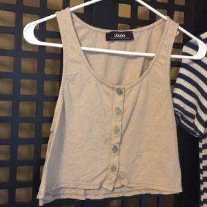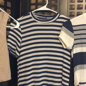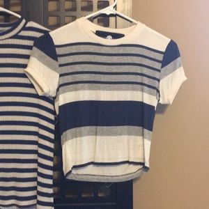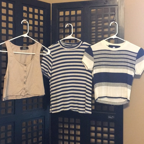 left to right ~ LuLus brand tan crop top ( no size labeled ) but I wear a size xs-s / the other two stripped tops were purchased from nasty gal .. horney lunch brand and after party brand ( size xs )