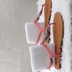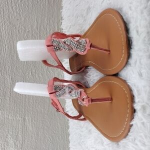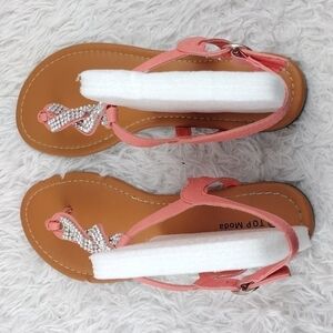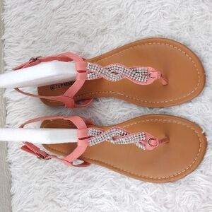 TOP Moda Women's Tan/Pink Faux Diamond Embellished Twist T-Stap Thong Buckled Ankle Four Hole Strap Almond Toe Flat Sandals. Rubber Sole. All Man Made. Scuff On Strap Per Picture. Minimal Sole Wear. Size 8.5. Color May Vary Due To Lighting.