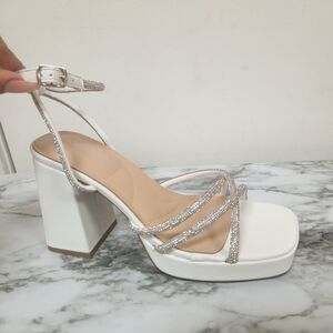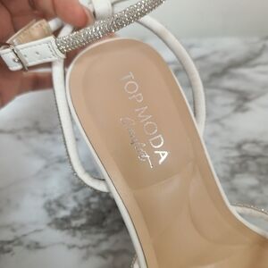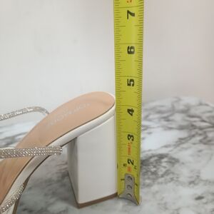 Chic white block heel with sparkling rhinestone straps. Adjustable ankle buckle for a secure fit. Padded insole offers comfort. Sleek square toe for a modern look. Ideal for dressy events and nights out.