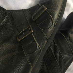 TOP SHOP black leather buckle design, distressed look, biker boot, knee high, sz 38, fits like 7.5 or 8. Long back zip entry with loose top fit. Very comfortable