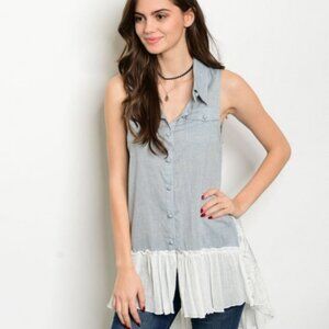 Lovely button down tunic style top featuring lace details on sides,chiffon ruffle around the bottom & pockets details. Pair with jeans/leggings & heels for a fabulous look