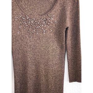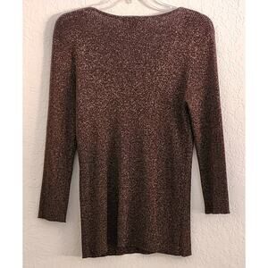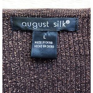 Pretty brown with gold shimmer threads top by August Silk. This is a slim fitting top with a low scoop neckline. It has beading on the front. It has 3/4 length sleeves. The material is 39% Viscose, 33% Silk, 19% Polyester, 9% Metallic. It is a pullover top. It is marked as SIZE LARGE, BUT looks smaller than a large, more like a MEDIUM. The fabric does have some give to it, but I think it would be a slim fit large.