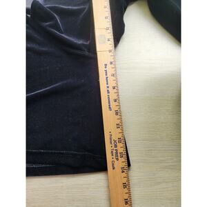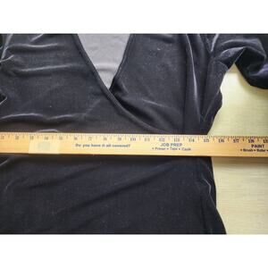 Pretty black velvet top by Casual Corner. This is a soft velvet. It is long sleeve. The front is a cross over at the waist with a deep V-neck. It is a pretty soft velvet top. It is SIZE LARGE
