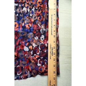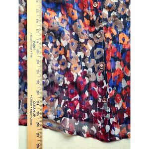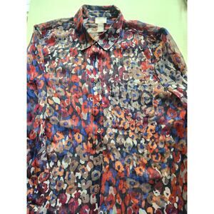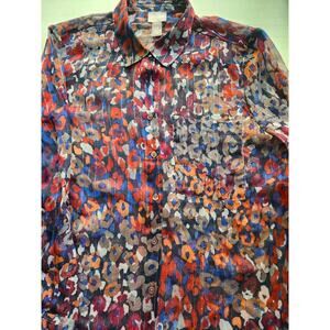 Nice shirt style top by Chico's. This is a sheer top that would work with a tank type top or alone with a bra, but it is sheer. It has long sleeves with a button at the cuff. It buttons up the front with slits at the side at the bottom hem. It is a pretty abstract print in nark blue, rust and gives off fall like colors. There are pinstripes of silver thread running vertically. It has one front pocket on the left breast area. It is Chico's size 1 /SMALL. See Chico's size chart in the photos.