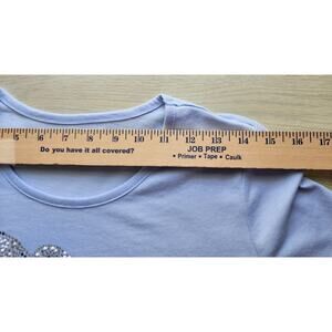 Cute top in light blue by Coral Bay. It has a rabbit on the front that is made of faux white pearls, clear rhinestones, and dark blue rhinestones. It is a short sleeve top that is a cotton/polyester blend. It is NEW WITH TAGS. It is SIZE SMALL.