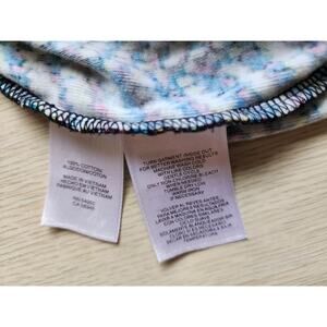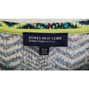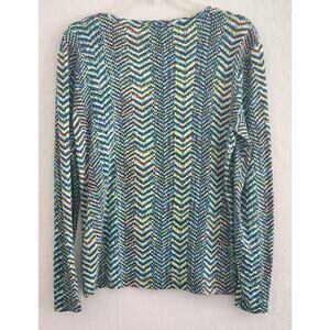 Nice cotton top by Jones New York Signature. It has blue, green, yellow, red colors in a chevron pattern. It is a soft fabric. The top has long sleeves with a round scoop neckline. It is SIZE PETITE / LARGE.