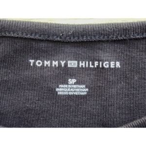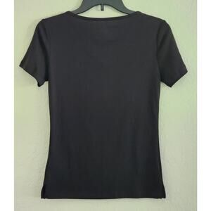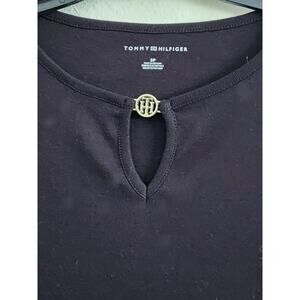 Nice simple style top by Tommy Hilfiger. This is a solid black pullover top. It has short sleeves. The bottom has slits on the side hem. There is a metal piece in the keyhole neckline with "TH" in a silver tone. It is size SMALL PETITE.