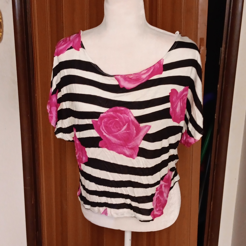 topia rose stripped top round neck line short sleeves open back made of 100% rayon sizes S, L. BRAND NEW WITHOUT TAG