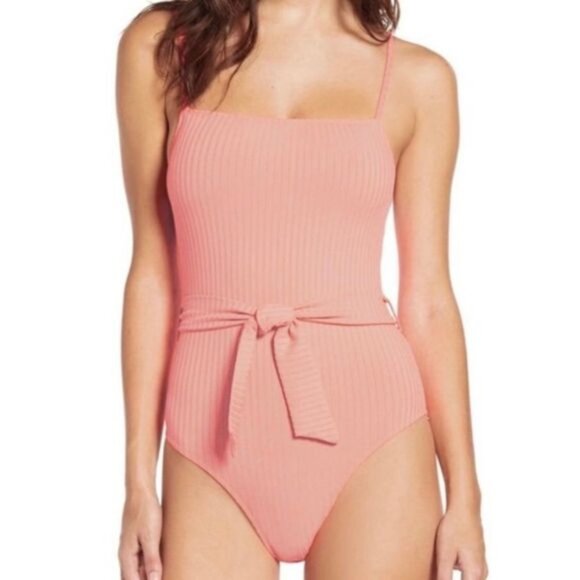 Accentuate your shape in this sleek ribbed one-piece designed with slinky straps and a waist-defining sash.