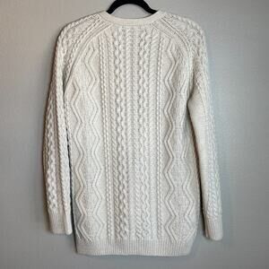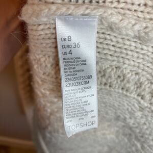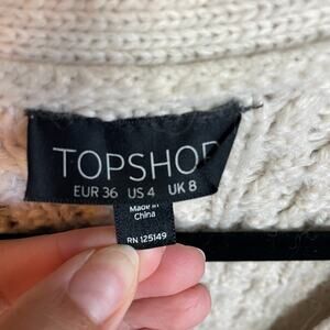 Approx measurements: pit to pit 20", waist 38", length 25". The TOPSHOP Cable Knit Cardigan in Cream Ivory is a stylish and versatile piece for any wardrobe. Made from a blend of Nylon, Acrylic, and Angora Rabbit, this oversized cardigan features a V-neckline, long sleeves, and button accents. Its cable-knit style adds a touch of texture, while its solid color and classic design make it suitable for various occasions such as casual outings, workwear, or even travel. Machine washable and with a regular fit, this cardigan is perfect for all seasons and is sure to become a staple piece for any fashion-forward woman.