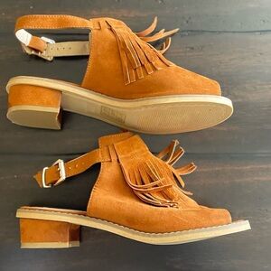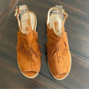 TOPSHOP Faux Suede Boho Fringe Open Peep Toe Heeled Sandals. Hobo fringe with a lush suede finish add plenty of 70s flair to a standout peep-toe sandal set on a modest wrapped heel. Small section of inside right shoe is peeling-see pic. Otherwise in excellent condition. Ship same/ next day. Perfect sandal for the summer.