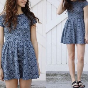 TOPSHOP Fit & Flare Skater Blue Knit Dress with Geometric Tile Print
