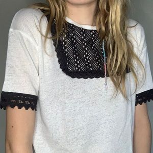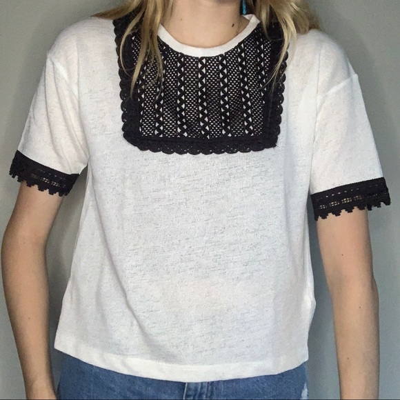 ☕️ Cutest lil classy topshop blouse! Adorable black lace detail on sleeves and chest. Perfect for lunches and outings! So cute.
