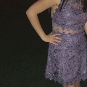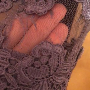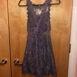 Detailed purple/grey lace dress with an opened back. The material is very thick and well made. Worn once. As you can see in the picture above, there is a small hole in the mesh at the stomach area; the dress was purchased like that. Willing to negotiate. Please feel free to ask any questions you may have :)