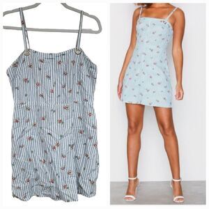 TOPSHOP Linen Blue Striped Floral Pinafore Shift Dress Sleeveless Mini Sundress