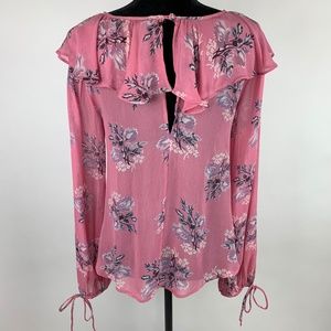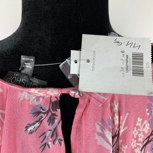 [TOPSHOP] NWT Pink Floral Ruffle Blouse. Size 2. Adorable pink & lavender floral sheer top! Pink color on closer pictures is most accurate pink color. Delicate and feminine with such cute pompom tie strings! Couple tiny snags shown in last picture.
