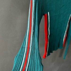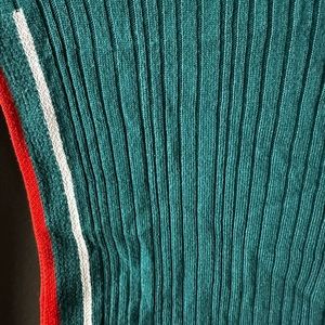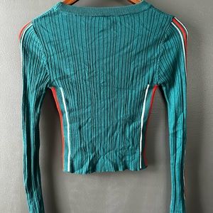 Teal green rubbed sweater with white and orange stripes down each arm and sides of body. No pilling.