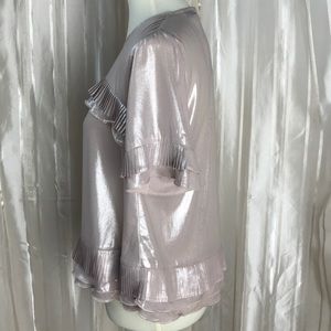 Ruffled on Top, on Sleeves and on the bottom with a Nice wavy design below the ruffle!