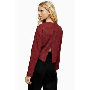 TOPSHOP Split Back Cut & Sew Sweater Rust Long Sleeve Top Casual Ribbed Size 14. Keep it casual-cool in this slouchy cropped sweater styled with a soft texture and an eye-catching cutout back. Crewneck. Long sleeves. Split open back detail. Ribbed fabrication. 85% polyester 15% viscose. B30922.