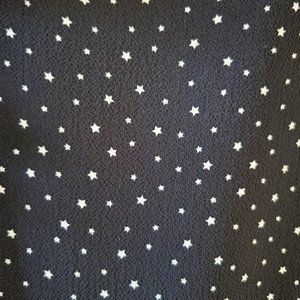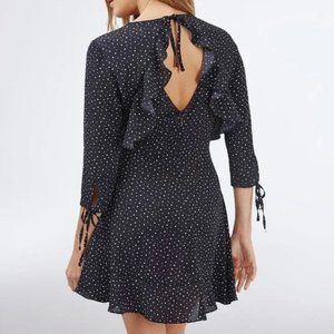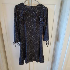 Black color with white star print. Ruffle accent along the front with open back and 3/4 length tie sleeves. Hidden back zip and tie closure. Excellent like-new condition.