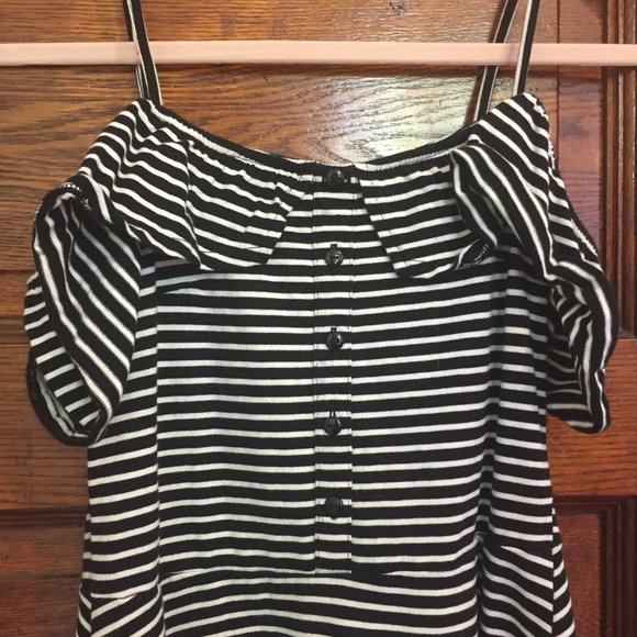 Ruffled sleeve around the edges with an A-line cut, tight bodice and flared skirt. Fits small-medium.
