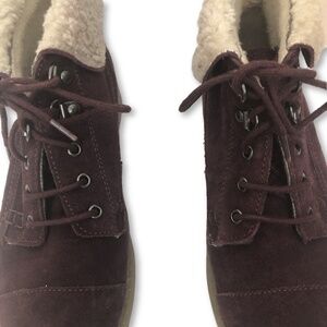 TOPSHOP suede lace up chukka style boots. The color is a plum (purplish/red). Fleece lined. Rugged rubber non slip soles with short heel.