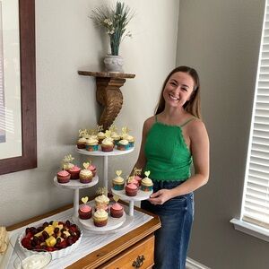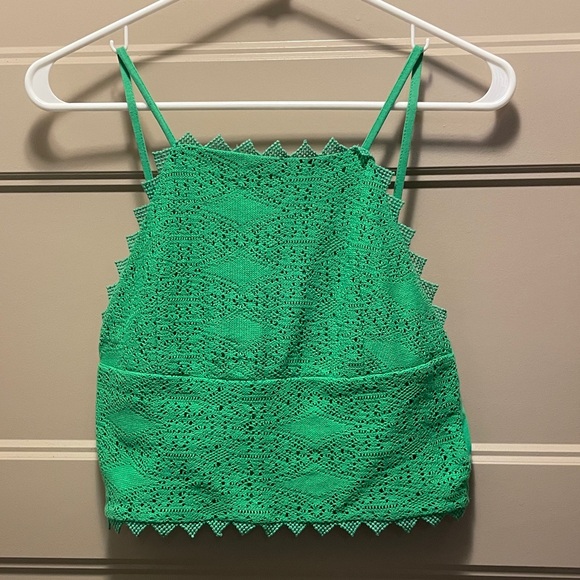 Green crop top with crochet overlay on front. Chest - 14” across, does not stretch much