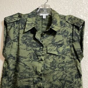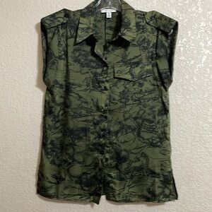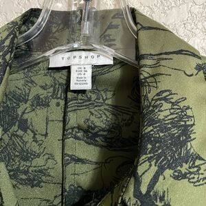 Topshop women’s green tie front button-down sleeveless sleepless shirt with front pocket a unique green pattern top. Perfect for casual wear. Size 4
