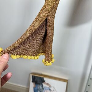 Pullover. Mock turtleneck. Long flare slitted sleeves with lettuce hem cuffs. Ribbed Marled mustard gold . Lightweight. Fitted. Stretch material. Fall trend. Y2K. Alternative. Funky. Retro style. 1970s inspired. A
