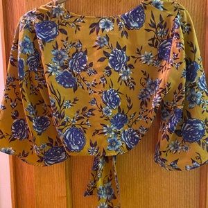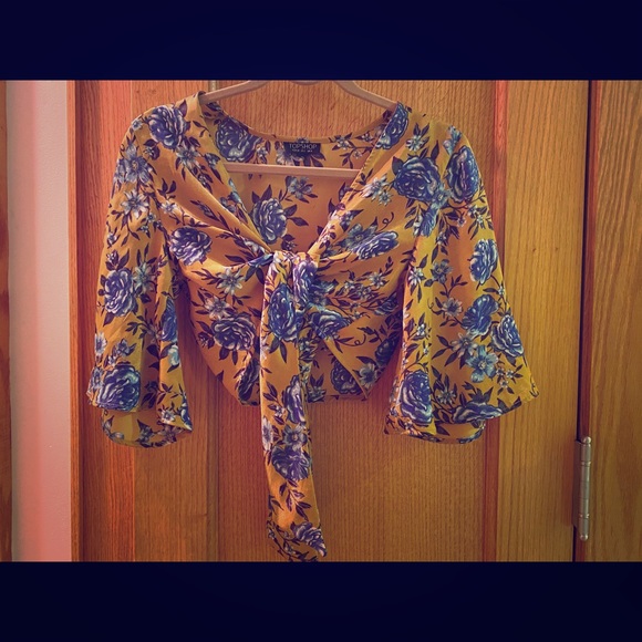 Silky smooth crop top blouse from TOPSHOP. Has a lovely mustard color with blue floral pattern. Ready for adoption :-)