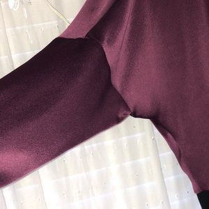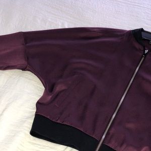 A light yet fashionable burgundy satin bomber jacket with black trim along the neck and sleeves