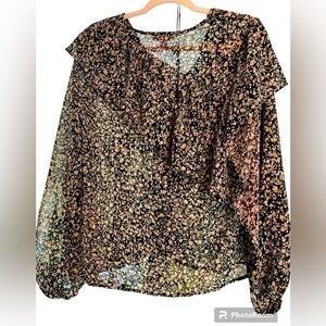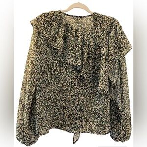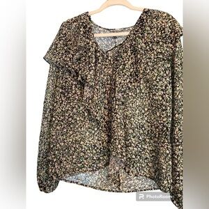 TOPSHOP top, black with floral green and rose Asymmetrical ruffles front to back