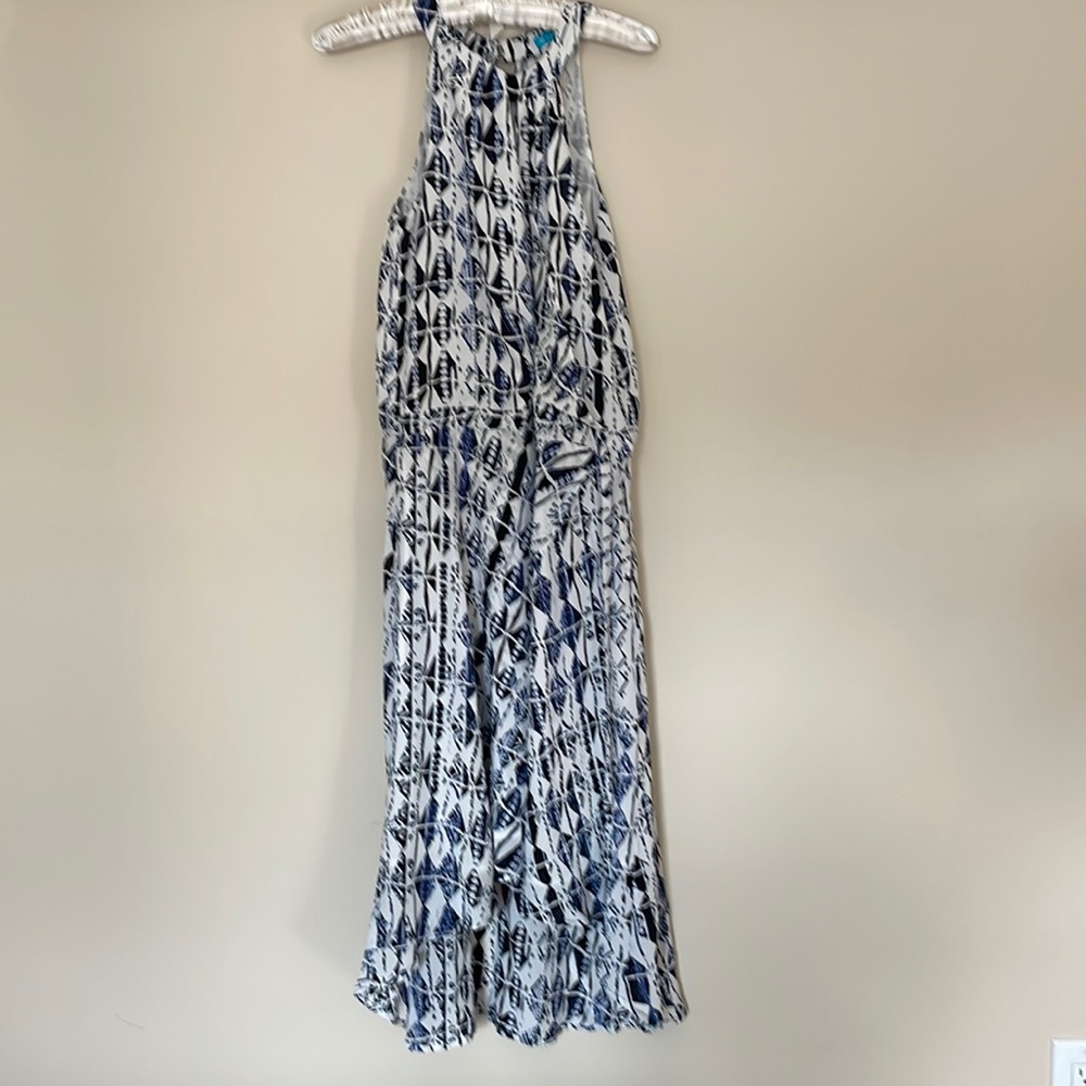 Beautiful summer dress with detail around the neck and asymmetrical skirt ( shorter in the front) drawstring in the waist , very good condition