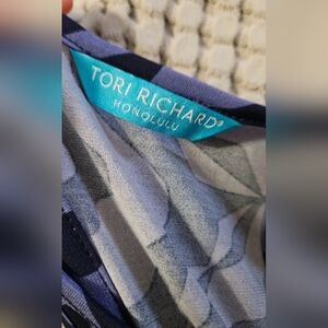 This Tori Richard honolulu dress features a captivating blue and black color palette with a scoop neckline and sleeveless design. The sheath style offers a sleek silhouette, ideal for both casual and work occasions. Its maxi length adds a sophisticated touch, making it a versatile wardrobe staple.