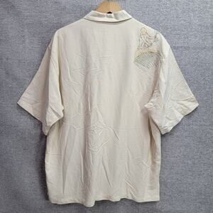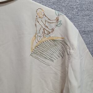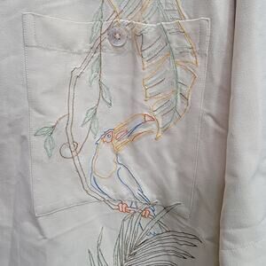 Cream color short sleeve silk button down shirt with embroidered tucan, monkey, and palm tree. Size L, pre-owned in great used condition.