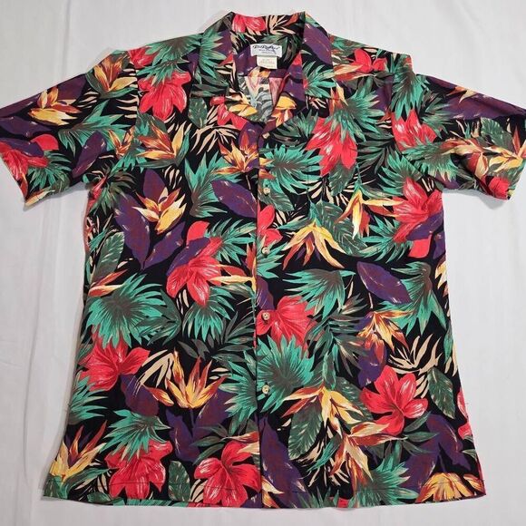 TORI RICHARD VINTAGE HAWAIIAN CAMP SHIRT MENS SIZE LARGE BLACK BIRD OF PARADISE