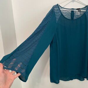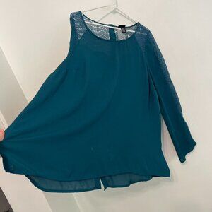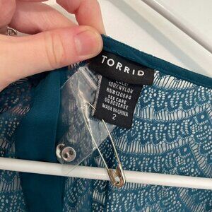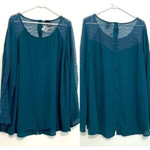 TORRID 2 Plus Size Lace Inset Georgette Blouse Solid Teal Blue Green Long Sleeve