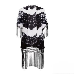 Enjoy those backyard summer festivities in this stunning lightweight kimono that has a tie-dye wash and is adorned with fringe trim.