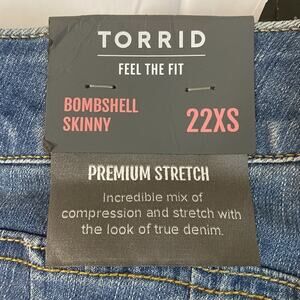 New with tags TORRID BOMBSHELL SKINNY PREMIUM STRETCH HIGH-RISE DESTRUCTED JEANS. Size 22XS, High rise, Super skinny fit from hip to ankle, Gap-proof elastic waistband for all-day comfort, Perfect for every body shape with ultimate comfort and compression, Inseams: Ex-Short 25". See pictures for details.