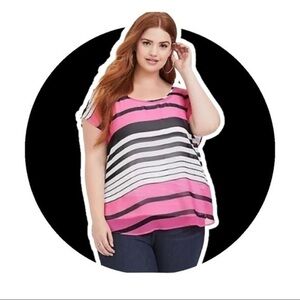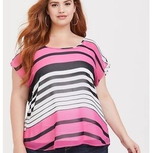 We are over-the-top about this colorblock top. Pretty pink adds a rich pop of color to this black and white striped number. A button-back gives it a fashion-savvy vibe. It's lightweight, semi-sheer and a fabulous way to liven up your closet.
