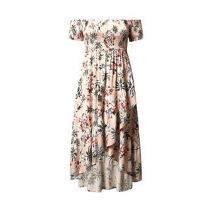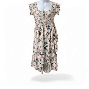 Women's plus size short sleeves smocked black floral tropical print off shoulder maxi dress.