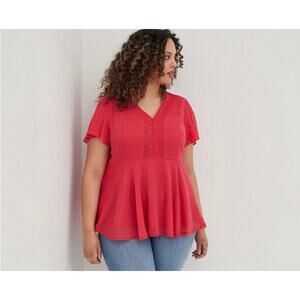 TORRID blouse, size 2 (Plus Size). Romantic and feminine dark pink peplum blouse with short flutter sleeves, lace trim, and clip-dot detailing throughout the fabric. Features a sheer outer layer with a soft, solid lining underneath for comfort and coverage.