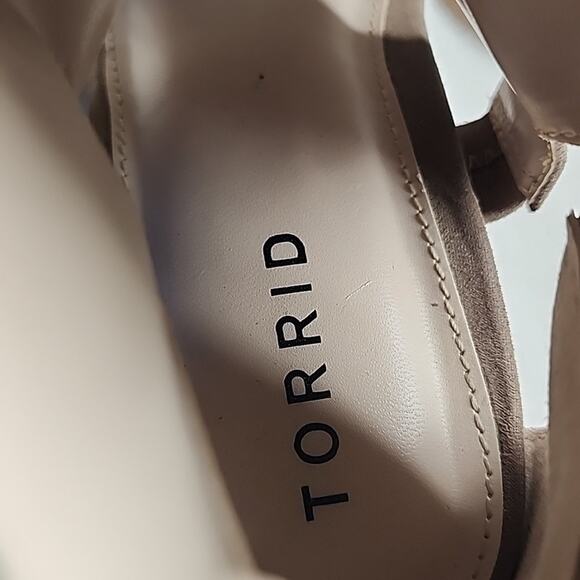 HELLO, THESE TORRID CUTOUT PEEP-TOE WEDGES IN TAN SUEDE FEATURE BACK ZIPPERS FOR EASY OFF AND ON. THEY HAVE BEEN CUSTOM PAINTED WITH BOTTOM SOLE PAINT, THEY LOOK GOOD NOW. THE INSIDE INSOLES LOOK CLEAN, PLEASE REVIEW PICTURES.