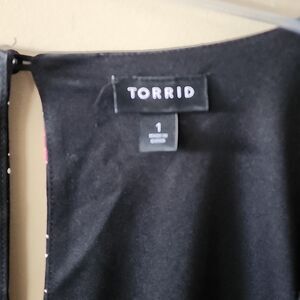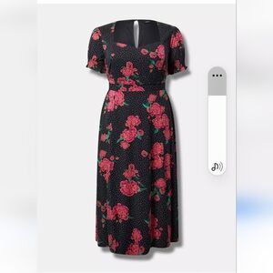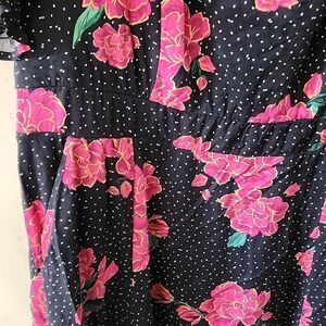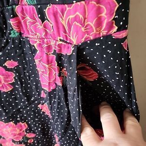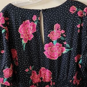 Elegant black dress with vibrant pink floral patterns. Perfect for any occasion. key hole back pockets gathered sleeves excellent condition